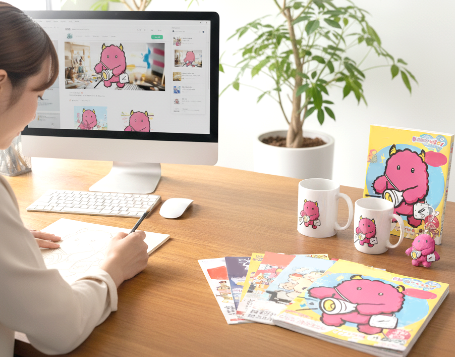 キャラクターは完成してからが本当のスタートです。Web サイトやSNS での情報発信、パンフレットやノベルティグッズ、着ぐるみなど、あらゆる販促展開をワンストップでサポートします。キャラクターを軸とした多角的なプロモーションで、お客様の取り組みを力強く後押しします。