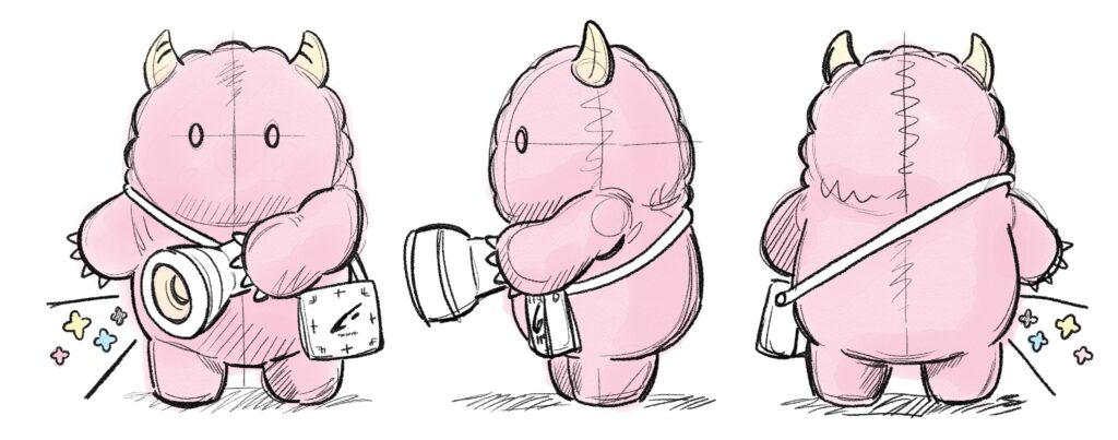 ぬいぐるみや着ぐるみ、オリジナルグッズといった立体物に展開することで、ユーザーとの接点を増やし、より強い愛着を育みます。当社では、立体化の「設計図」となる 3 面図の制作から立体物の仕上がりまで一貫して対応いたします。 ※3面図やぬいぐるみはイメージです
