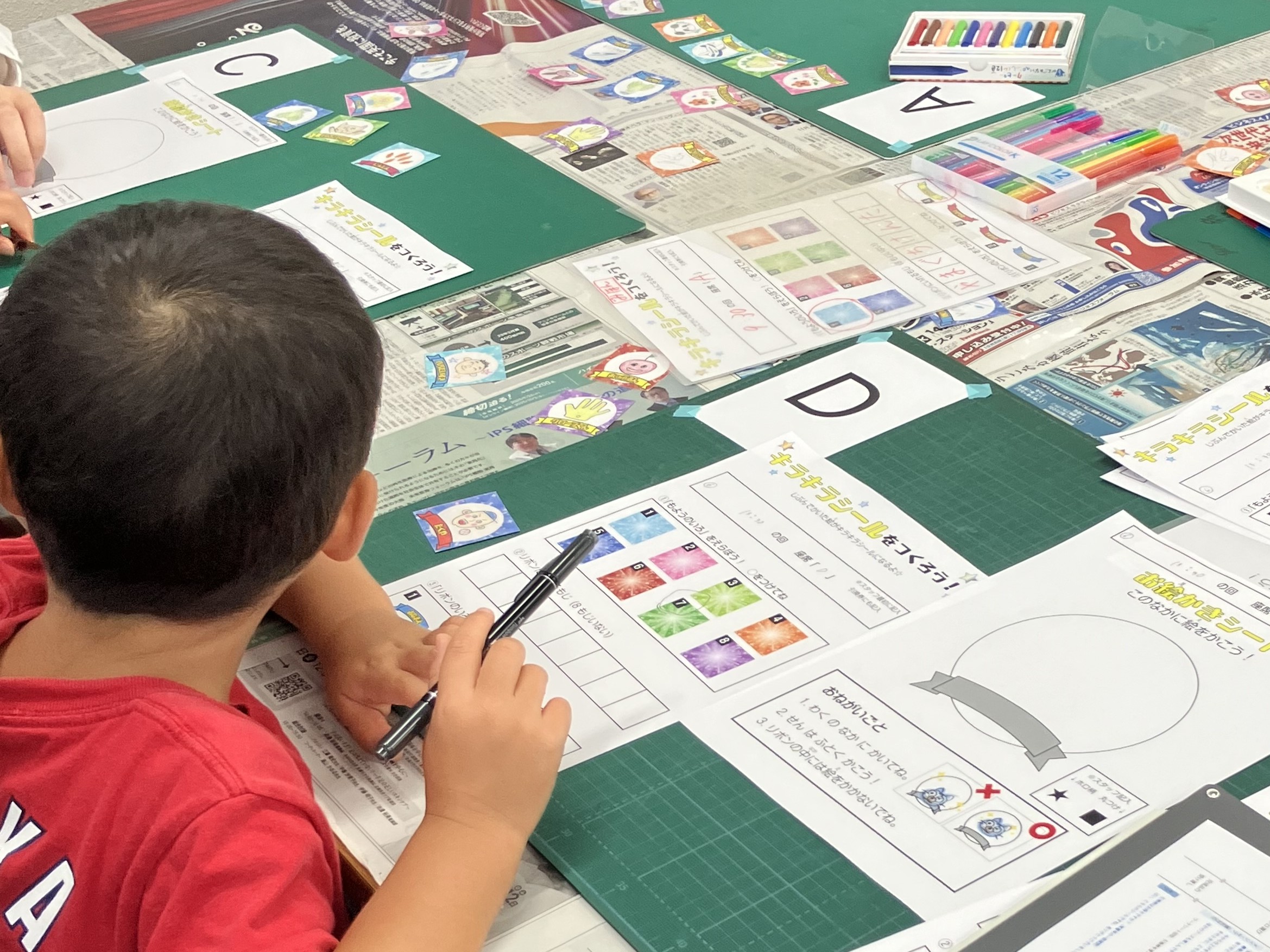子どもたちは思い思いに描いたキャラクターや動物、好きな食べ物などのイラストを、その場でオリジナルのシールに仕上げる体験を楽しんでいました。完成したシールを見て笑顔を見せる姿がとても印象的でした。