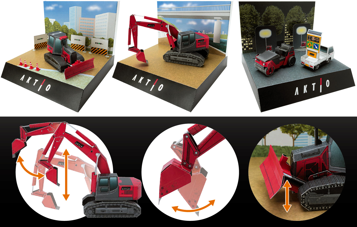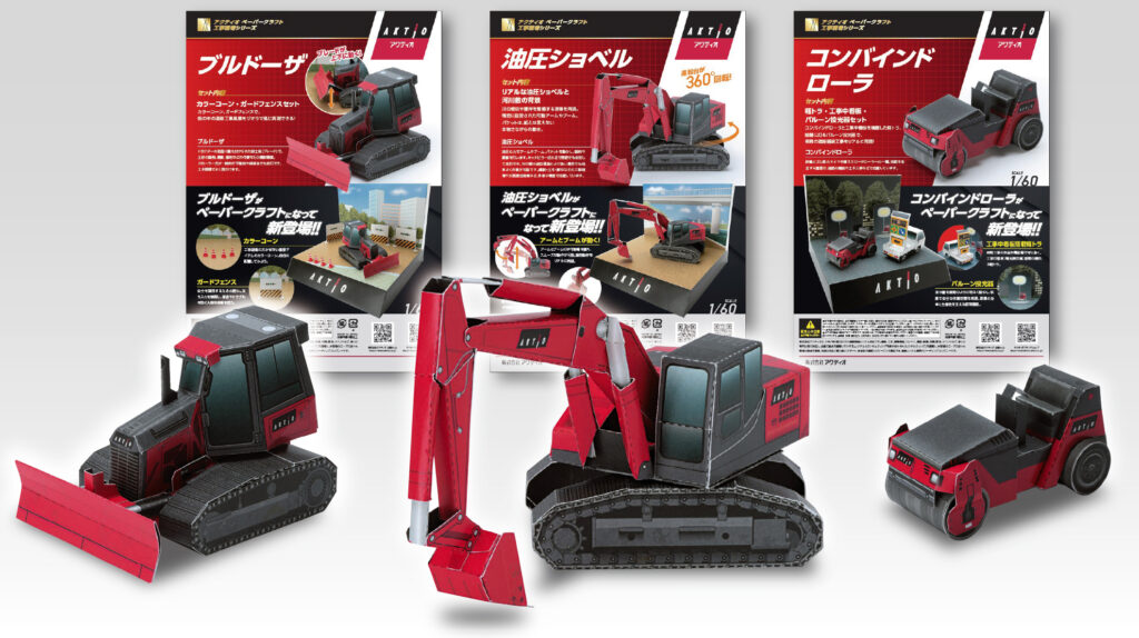 株式会社アクティオ様の建設機械3種(写真左からブルドーザ、油圧ショベル、コンバインドローラ)のペーパークラフトです。